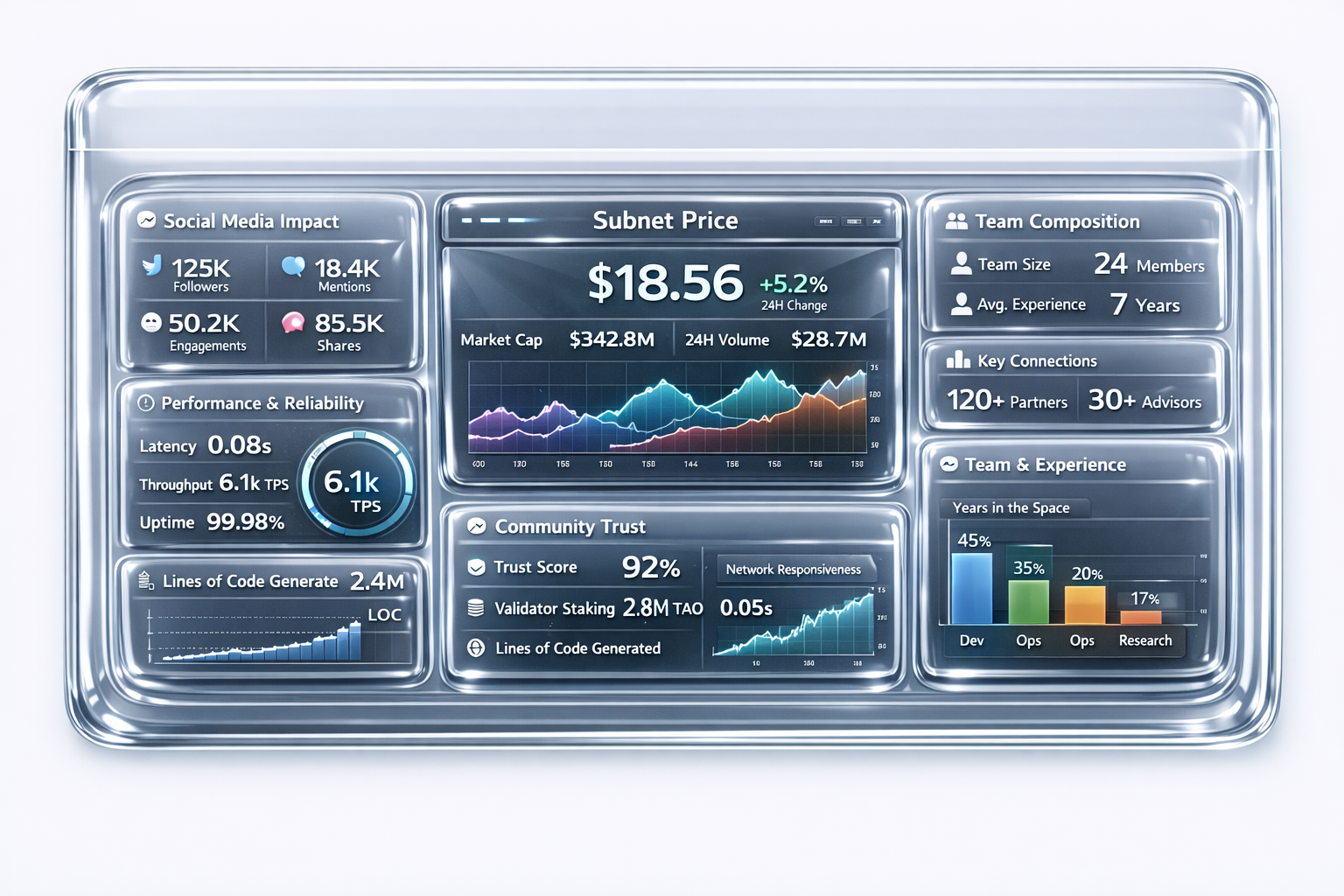 A transparent scoring system ranking subnets by performance, reliability, team strength, and market signals to help users make informed decisions.